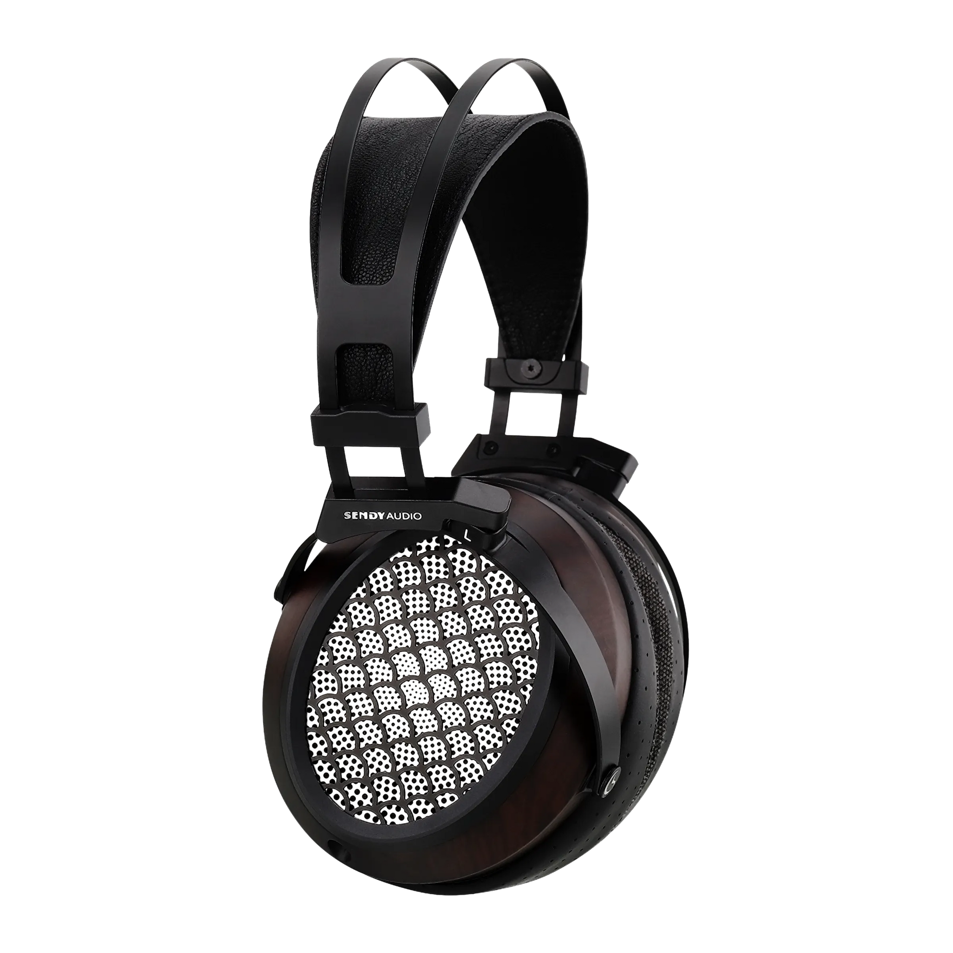 CNC-machined zebrawood housings provide a classic, premium look while exploiting the wood’s natural acoustic warmth. Metal structural components add rigidity and longevity, creating a balanced aesthetic of craft and precision. A fish-scale mesh detail completes the finish, offering refined visual texture without compromising acoustic transparency.